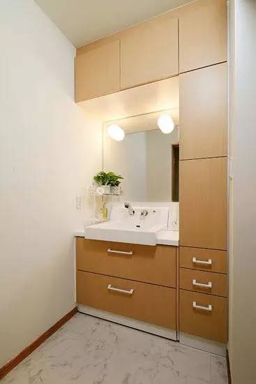 搭配TIPS:如果有足够的空间的话,不妨在贴近墙壁一侧摆放一个自上而下的洗漱柜。中间可以用作洗漱台,下面小柜子的样式,上面的部分也充分利用,可以将用来作为一个收纳空间,整体收纳柜样式,尽显实用。